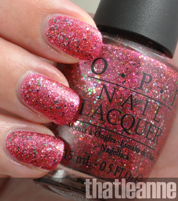 Above is a flash swatch of Gettin' Miss Piggy With It. Three coats but this polish is actually a little different in that while there are bigger silver chucks of glitter with the smaller red glitter, there's also big red chunks of glitter. This is the only polish of the 5 sheer clear base glitters that has bigger glitter in another colour.